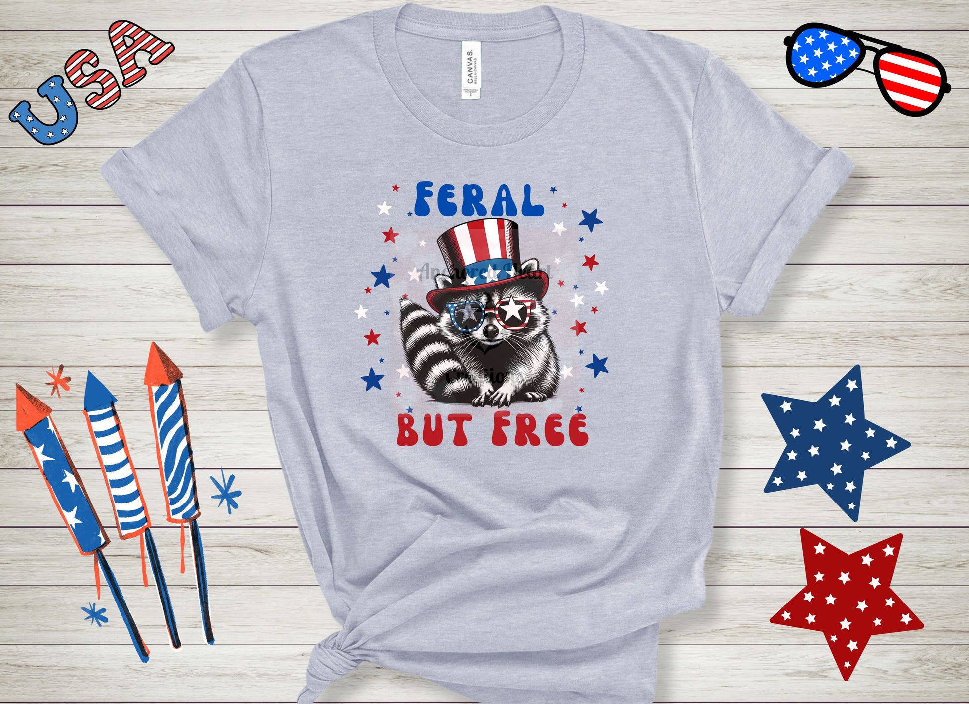 Raccoon 4th of July Unisex Tee, Feral but free, Patriotic Raccoon Shirt, Red White Blue Stars, USA Independence Day Top, July 4th Gift